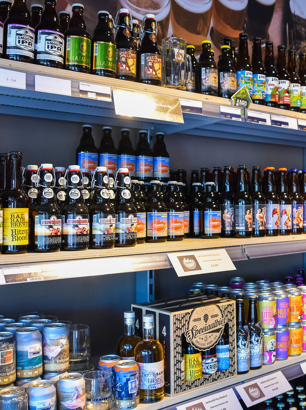 Cheerz heeft bieren van Zeeuwse grond, zelfs een eigen Zeeuws Tarwe tripel dat gebrouwen wordt in Hulst bij brouwerij Vermeersen. Ook de overige bieren van die brouwer staan jaar rond bij Cheerz. Maar ook de blikken van brouwerij KEES en flessen van Bad Hair Brewing en Baardaap uit Middelburg, de bijzondere craft bieren van Dutch Bargain uit Groede staan bij Cheerz altijd op de plank. Slot Oostende en Emelisse uit Goes, De Kip van Ossenisse en brouwer Rodanum van Aardenburg; Cheerz heeft ze zeker in het zomer seizoen wel in de winkel.